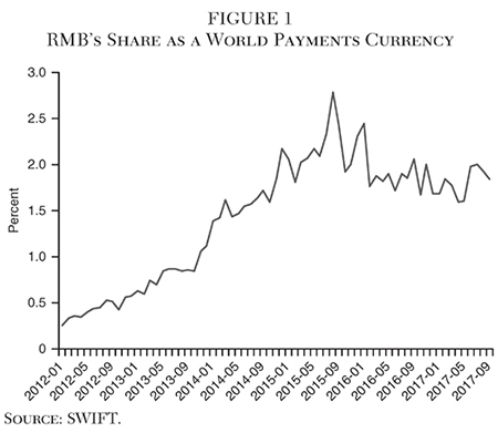 Initially there was steady and rapid increase in measures of internationalization, such as the RMB’s share in global payments (Figure 1). However, the growth came to an end in the middle of 2015, and since then China’s share has declined modestly. There was also an expectation that China’s growing role as a source of development finance would enhance the importance of the RMB. China in the period 2012–14 lent about $40 billion per year to developing countries for infrastructure projects, including along the Belt and Road, according to updated AidData (Dreher et al. 2017). Curiously, most of this lending is in dollars and only 2.6 percent was denominated in RMB.