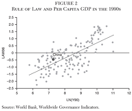 China was measured to be about half a standard deviation below the mean on the index: it did not have especially good economic institutions. However, it was above the regression line, indicating that it had good institutions for its level of development. Another way to express this is that China’s Rule of Law Index in 1996 was at the 45th percentile among countries. Its per capita GDP in 1990 was at the 23rd percentile among countries.