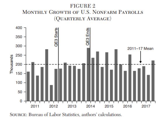 As shown in Figure 2, the launching of QE3 and the initiation of explicit forward guidance appear to have had only muted effects on the U.S. labor market. Growth in nonfarm payrolls during 2013–14 was practically identical to its average pace from 2011 to 2017, with no evident acceleration due to QE3 nor any apparent deceleration following the conclusion of QE3.