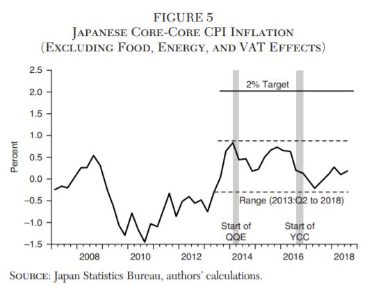 Further evidence on the muted effectiveness of unconventional monetary stimulus can be obtained by considering the recent experiences of other major economies where conventional policy has been constrained by the ELB. For example, the Bank of Japan (BOJ) launched its quantitative and qualitative easing (QQE) program in April 2013 and augmented that program in September 2016 by initiating yield curve control (YCC).7 Under QQE the BOJ’s securities holdings have expanded by about ¥400 trillion, equivalent to roughly 80 percent of Japanese GDP. As shown in Figure 5, however, Japanese core-core inflation (excluding food and energy prices and the direct effects of the 2014 VAT hike) has remained far below the BOJ’s 2 percent inflation target. Indeed, over the past year this indicator and other BOJ measures of underlying inflation in Japan have been mired close to zero.