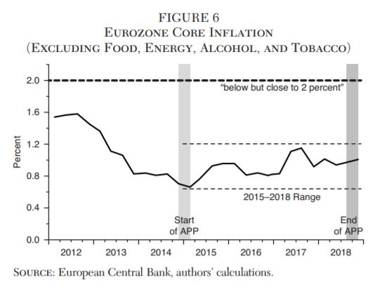 The European Central Bank (ECB) announced its asset purchase program (APP) in late 2014 and initiated large-scale securities purchases — including government securities, corporate bonds, covered bonds, and asset-backed securities — in March 2015. Since that time, the ECB’s asset purchases have totaled about 2.5 trillion euros, equivalent to about 15 percent of eurozone GDP. The ECB has specifically stated that this program was intended to “address the risks of too prolonged a period of low inflation.”8