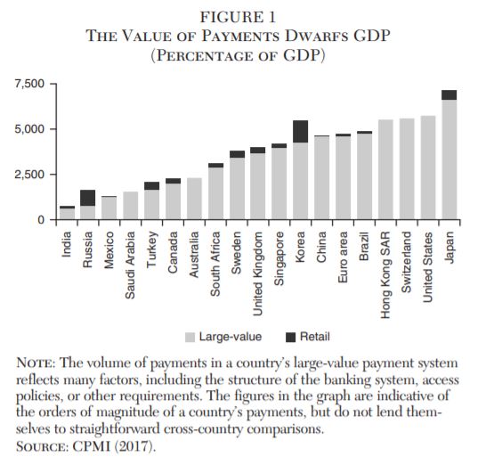 The sheer volume of payments in our modern economies highlights their importance. The volume exceeds GDP many times over, thousands of times in fact (Figure 1). To a large extent, this is because most of the payments correspond to financial transactions and their volume dwarfs “real” economic activity. Hence, also the common, largely efficiency-driven, distinction between wholesale payment systems, designed to deal with large-sized transactions, and retail ones, that deal with small-sized ones.