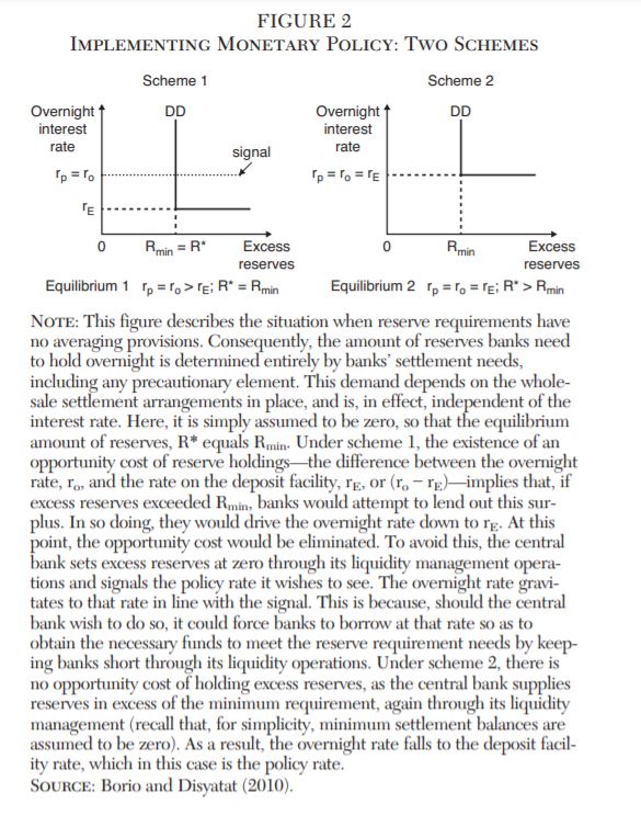 There are two polar cases. In the first, the central bank satiates the market with bank excess reserves — the means of payment (scheme 2, right-hand panel). Then the demand for the means of payment becomes infinitely elastic at the rate paid on them, that is, the rate on the central bank deposit facility: supply becomes irrelevant. In the second, the central bank meets exactly the demand for means of payment rather than satiating the market (scheme 1, left-hand panel). The key point here is that because the uncertainty regarding interbank settlement is minuscule and banks can count on the central bank to allow the system to settle by providing the necessary funds, the demand for bank reserves is, in effect, vertical at some frictional level — that is, unresponsive to the interest rate. The central bank then simply sets the desired interest rate by signaling where it would like it to be. And it can do so because it is a monopoly supplier of the means of payment: it can credibly commit to provide funds as needed to clear the market. To simplify, scheme 2 is how the central banks that have engaged in quantitative easing (QE) are setting interest rates today, although some central banks were operating the scheme even before; scheme 1 is how most other central banks are doing it.12 What the example makes clear is that, at least under current institutional arrangements, there is no such thing as a well- behaved demand for bank reserves, which falls gradually as the interest rate increases (i.e., which is downward-sloping).