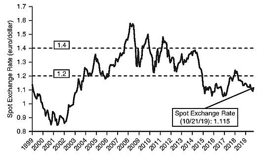So, in the interest of stability and economic freedom, it is time to jettison the international monetary anti-system. Just what has to be stabilized? The world’s two most important currencies—the dollar and the euro—should, via formal agreement, trade in a zone of stability ($1.20–$1.40 per euro, for example). Under such an agreement, the European Central Bank (ECB) would be obliged to maintain this zone of stability by defending a weak dollar via dollar purchases. Likewise, the U.S. Treasury (UST) would be obliged to defend a weak euro by purchasing euros. Just what would have happened under such a system (counterfactually) since the introduction of the euro in 1999 is depicted in Figure 1. When the euro-dollar exchange rate was less than $1.20 per euro and the euro was weak, the UST would have been purchasing euros (in the 1999–2003 and the 2014–2019 periods). When the euro-dollar exchange rate was above $1.40 per euro and the dollar was weak, the ECB would have been purchasing dollars (in some of the 2007–2011 period).