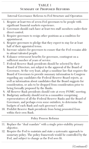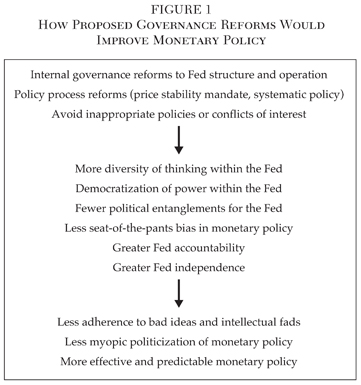 Table 1 summarizes the three sets of reforms proposed in this testimony: internal governance reforms, policy process reforms, and limits on Fed asset holdings and activities. Together these proposed reforms would provide a new approach to governing monetary policy, which would result in better monetary policy decision-making than we have witnessed in the troubled first century of the Fed’s history (through the channels of influence summarized inFigure 1). A central bank that operates as a more democratic institution, is able to benefit from more diverse thinking, is required to follow transparent and systematic policy actions in pursuit of achievable objectives, is held accountable for its actions, and is freed from myopic political pressures and less conflicted by non-monetary policy mandates and tools would be much more likely to achieve the proper objectives of monetary policy.