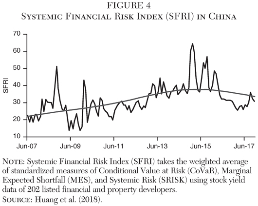 An even more worrisome development is the steady rise of financial risks. Although the Systemic Financial Risk Index (SFRI) fluctuates violently, it has been on the rise since 2008 and stays at elevated levels (Figure 4). At the macro level, there are at least three sets of factors contributing to the recent rise of SFRI. First, persistent growth slowdown led to significant deterioration of corporate balance sheets, which added to financial risks. The divergence of state and nonstate sectors’ corporate leverage ratios further exacerbated the problem. In particular, in the past, the Chinese economy grew at very rapid and stable growth rates. The authorities were able to resolve or, at least, to hide temporarily from any financial risk factors, even if they did occur. However, that is no longer possible.