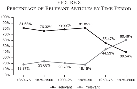 We should also note that each dataset contains articles that are unrelated to our area of study, even though they are responsive to the “monopoly” keyword. Those articles have been removed from our results, though the line between relevant and nonrelevant articles is sometimes blurry. For example, we did not remove articles that deal with statutory monopolies, patent-protected monopolies, and firms protected by international tariffs (throughout history the press has often used the monopoly term to refer to such). As a result, our dataset contains some articles that do not match the conventional understanding of monopoly.