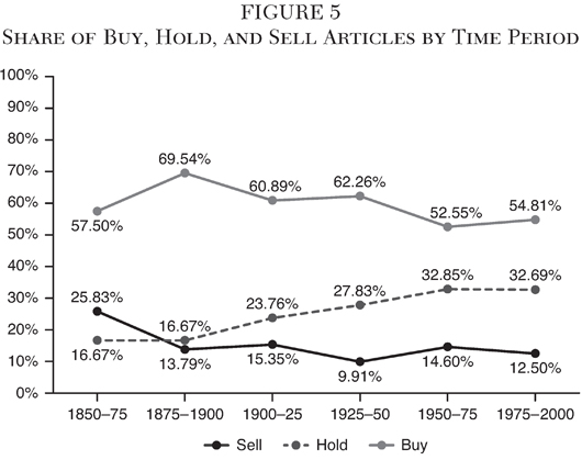 The second test (pessimism) also tends to confirm our intuition, though the trend is less pronounced than in the first test. Over the years, the press has purveyed a mostly bullish outlook on the persistence of monopolies. Our dataset contains 574 buy articles (60.48 percent), 235 hold articles (24.76 percent), and 140 sell articles (14.75 percent), as shown in Figure 5. One noteworthy trend is the steady increase in hold articles between 1900 and 1950.