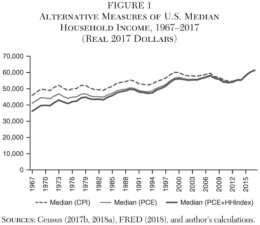 In its annual report on incomes and poverty, Census (2018a) reports real median household income over time deflating by a “research” version of the consumer price index (CPI-U-RS, or CPIRS), compiled by the Bureau of Labor Statistics. In contrast, in its corresponding analysis, the Congressional Budget Office (CBO, 2016, 2018) deflates using the personal consumption expenditure (PCE) from national accounts, prepared by the Bureau of Economic Analysis. Over the past five decades, the cumulative rise in the CPIRS is substantially greater than that in the PCE. Thus, with the average for 1967–70 as an index base of 100, by 2017 prices rose to an index of 603.7 in the CPIRS but only 540.2 in the PCE.5 Cumulative inflation over this period was thus about 12 percent higher in the CPIRS than in the PCE. Most analysts consider the PCE to be the better index because it takes much better account of substitutability as relative product prices change.6