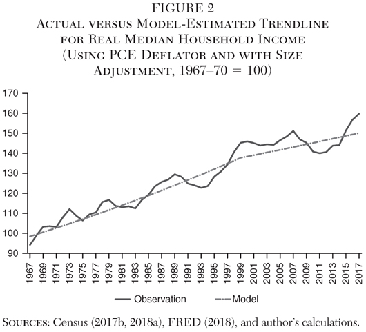 The column for “g” indicates that whereas the Census estimates showed annual growth of only 0.56 percent from 1967 through 1999, replacing the CPI-U-RS deflator by the PCE boosts this rate to 0.74 percent, and adjusting the PCE-deflated series for household size boosts this period’s growth rate further to 1.05 percent. The column for “δ” indicates that this long-term annual growth rate shifts downward by about 0.47 percent after 1999 for the Census series, 0.2 percent for the PCE-deflated series, and by 0.57 percent for the series additionally adjusting for household size. As a consequence, for 2000–17 the trendline growth (g − δ) falls to less than one-tenth of 1 percent annually in the Census series, but remains considerably more substantial at 0.5 percent annually in the PCE-deflated series and 0.48 percent annually in the series additionally adjusted for household size.