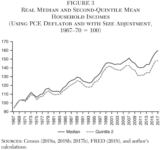 15By definition, the median of the full population equals the median of the third quintile. Because income levels would generally be expected to rise more than linearly as the percentile in the distribution rises, the mean would be expected to exceed the median for the quintile. However, in the third quintile, the two are almost the same: the median for all households in 2017 was $61,372, and the mean was $61,564 (Census 2018a, 2018b). Comparison of the means of both the second and third quintiles (rather than using the median for the third quintile) would thus show paths almost identical to those shown in Figure 3.