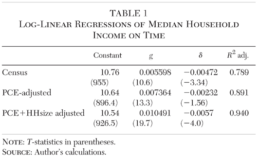 Table 1 reports the results of applying the log-linear regression estimates of growth rates using equation (4) discussed earlier. The t-statistics shown in parentheses all indicate significance at the 5 percent level or better,10 and the adjusted R2 reaches 94 percent in the estimates with PCE as the deflator and adjusting for household size.