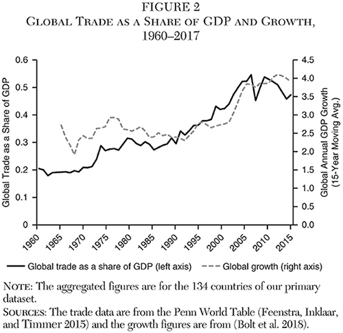 Using the Penn World Table merchandise trade data, Figure 2 shows the path of international trade as a share of GDP for the world during 1960–2017 (left axis) and the 15-year moving average of annual real per capita GDP growth during 1950–2017 (right axis).9 The growth figures are from the Maddison dataset (Bolt et al. 2018) because these data are more complete than the Penn World Table data for the years prior to 1970. During 1960–2017, international trade increased persistently and substantially as a share of global output. During the 1960s, the trade/GDP ratio averaged 19 percent of world GDP. By 1970, the ratio had risen to 20 percent, and by 1990, it was at 32 percent. It continued to rise, reaching 43 percent in 2000 and 50 percent in 2010. Since 2010, the ratio has fluctuated around 50 percent. Thus, international trade as a share of world GDP in recent years has been approximately 2.5 times the level of the 1960s.