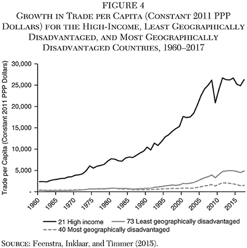 Following 1975, however, the expansion in merchandise trade for less geographically disadvantaged developing countries grew far more rapidly than it did for the geographically disadvantaged countries. By 2000, the per capita dollar value of international trade for the former group had risen to $1,936, while the same figure had risen to only $880 for the geographically disadvantaged group. The trend continued during 2000–17. By 2017, the real dollar value of international trade per capita of the least geographically disadvantaged developing countries had risen to $4,878, compared to $1,483 for the most geographically disadvantaged group. Thus, while per capita trade for both groups was equal in 1975, by 2017, the trade volume of the nongeographically disadvantaged developing countries was 3.3 times the trade volume of the geographically disadvantaged group. During 1975–2017, the per capita trade volume of the high-income countries rose from $5,547 to $26,273, an increase of 373 percent over 42 years. During this same time frame, the per capita trade for the less geographically disadvantaged developing countries rose from $649 to $4,878, an increase of 651 percent. Thus, the per capita real dollar value of international trade of the 73 developing countries rose by a substantially higher percentage than the parallel figure for the other two groups.