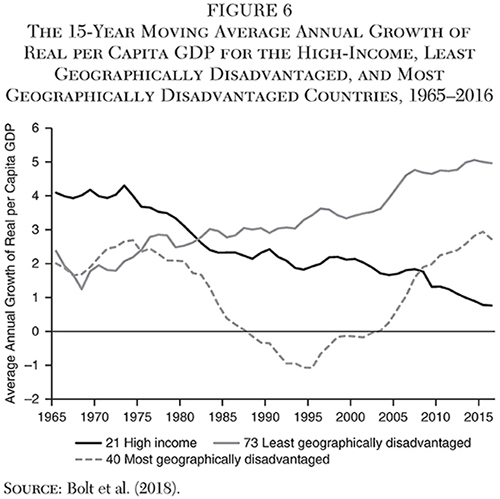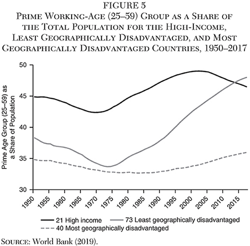 The virtuous cycle of development implies that these differences in demographic changes impact the pattern of economic growth for each of the three groups. The expansion in the share of population in the high-productivity, prime working-age category for the high-income countries during 1970–2000 and the less geographically disadvantaged developing countries during 1975–2017 tended to enhance their economic growth. On the other hand, the low and more stable prime working-age share of the population in the most geographically disadvantaged countries tended to adversely affect their growth and development.