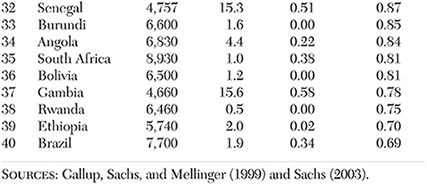 As Table 2 shows, the five most geographically disadvantaged countries are Burkina Faso, Mali, Niger, Chad, and Central African Republic. These five countries have high malaria ecology (20 or above) and are located approximately 5,000 kilometers (about 3,000 miles) from their closest major world market center (Rotterdam, New York, or Tokyo). Moreover, all five are landlocked with zero percent of their population residing within 100 kilometers of an ocean coastline. The standardized summary measure indicates these five countries confront unfavorable geographic conditions that are between 1.78 and 2.54 standard deviations from the world sample mean. Thirty-six of the 40 most geographically disadvantaged countries are Sub-Saharan African. The four exceptions are Latin American countries: Paraguay, Argentina, Bolivia, and Brazil. Among the 30 most geographically disadvantaged countries, all are Sub-Saharan African aside from Paraguay. Clearly, Sub-Saharan Africa dominates the list of countries with the most unfavorable geographic conditions.