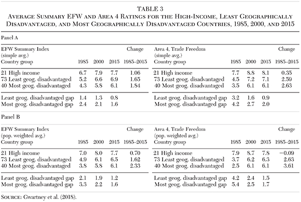 The reduction in transportation and communication costs will enhance incentives for developing countries to improve their economic institutions. Table 3 presents the simple mean (Panel A) and population weighted mean (Panel B) ratings for the summary economic freedom and freedom of international exchange (Area 4) using the Fraser Institute’s economic freedom of the world (EFW) data for 1985, 2000, and 2015 for the high-income and developing country groups (Gwartney et al. 2018). As expected, the ratings of the high-income group were greater than those of the developing countries. In 2017, the simple mean of the EFW summary rating for the high-income countries was 7.7, compared to 6.9 for the developing countries and 6.1 for the geographically disadvantaged countries.