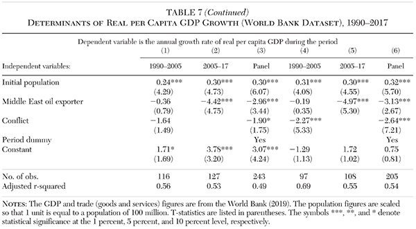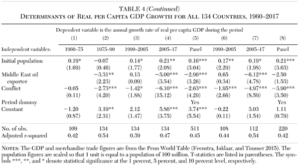 Four control variables are also included in our model: log of per capita GDP; population; and two dummy variables. The log of per capita GDP at the beginning of each time period is designed to reflect a country’s initial stage of development. If lower income countries are growing more rapidly than their high-income counterparts, this variable will be negative. This is often the case because low-income countries are able to copy (or acquire at a low cost) successful technologies and business practices of high-income countries. The reduction in transportation and communication costs of recent decades amplifies the importance of this factor. Population (in hundreds of millions), our second control variable, is expected to generally be positive because populous countries have larger domestic markets, which will result in larger gains from both the adoption of mass production processes and increased attractiveness to foreign investors. We included a dummy variable for countries experiencing conflicts resulting in more than one fatality per thousand during any of the last five years of a period. Since war and other forms of bloody conflict generally adversely impact economic growth, this variable is expected to have a negative sign. Finally, we included a dummy variable for six small middle eastern oil exporters (United Arab Emirates, Qatar, Bahrain, Kuwait, Oman, and Saudi Arabia). Somewhat paradoxically, the per capita GDP of these countries often declines during periods of high and rising oil prices because of increased inflows of immigrant workers with incomes well below the national average. Thus, this variable is expected to be negative, particularly when world oil prices are high.