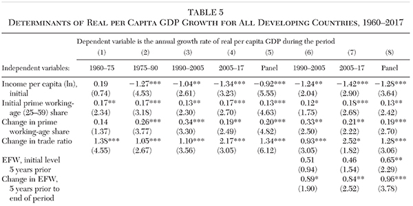 As in Table 4, the dependent variable in Table 5 is the annual growth rate of real per capita GDP. The independent variables are also identical. Even though the high-income countries were omitted from the version of the model used for Table 5, the results are similar to those of Table 4. Once again, the variables for international trade, change in the prime working-age share of the population, and economic freedom were highly significant. The coefficients of the international trade variable in the panel analysis (columns 5 and 8) were 1.34 and 1.28, respectively, indicating that a one unit increase in the trade variable increases the annual growth rate by an estimated 1.3 percentage points. This is virtually the same as the estimates of Table 4. Both the level and change in the share of population in the prime working-age category were highly significant. The coefficients in the panel regressions indicate that a one percentage point increase in the share of population in the prime working-age category increases the annual growth rate by approximately two-tenths of a percentage point. Again, the coefficient for the change in economic freedom (0.96 in the panel analysis) indicates that a one unit change is associated with a little less than a percentage point increase in the annual growth rate of real per capita GDP. The control variables and explanatory power of the model are virtually unchanged from the results of Table 4. These findings show that the trade, demographic, and economic freedom variables continue to exert a strong impact on economic growth when only developing countries are included in the analysis.