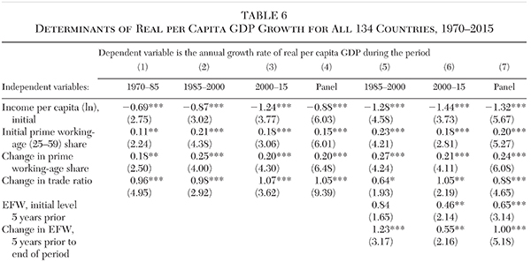 Table 6 is similar to Table 4 except the time periods differ. Table 6 shows the results of the model for three alternative 15-year periods: 1970–85, 1985–2000, and 2000–15. Again, the dependent variable is the annual growth rate of real per capita GDP during each period. The results show that our model is highly stable across varying time periods. The coefficients of the trade variable (1.05 and 0.88 in the panel analysis, columns 4 and 7) are slightly lower than those of Tables 4 and 5. However, these coefficients are actually a little more significant than they are in the prior analysis. Here, the t‑ratios for the trade variable coefficients are exceedingly high — 9.39 in the first panel regression, and 4.65 in the second. The coefficients on the change in the prime working-age share of the population were 0.20 and 0.24 in the two panel regressions, once again indicating that a percentage point increase in the share of population in the prime working-age group is associated with approximately two-tenths of a percentage point increase in the annual growth rate of real per capita GDP. The 1.0 coefficient for the change in economic freedom implies that a unit change in this variable enhances the annual growth rate by approximately one percentage point. The pattern of the control variables is also similar to that of the prior analysis. The r‑squares for Table 6’s panel equations (0.46 and 0.52) are a little higher than in Table 4, indicating a slight increase in the explanatory power of the model.