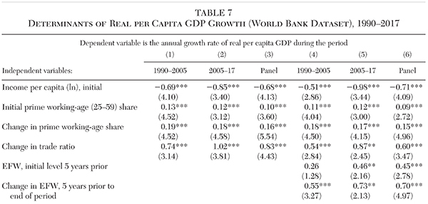 In addition to the robustness checks of Tables 5–7, other analyses were performed. The panel regressions of Table 4 were also run using a seemingly unrelated regression (SUR) model. The t‑ratios on the variables of interest were even larger than those shown in Table 4. Thus, the OLS results appear to be more conservative. In addition to SUR, the panel regressions were also run to account for fixed effects. The significance of the variables for international trade, change in the prime working-age share of the population, and economic freedom remained unchanged. We also re-ran Tables 4 and 7 with the primary trade variable expressed in per capita dollars (the change in the real value of trade per capita over the period divided by the initial real per capita GDP). Again, the results were similar and the modified trade variable remained a positive and significant predictor of economic growth. Finally, we extended the World Bank data from Table 7 back to 1985 and re-ran our model for the two periods between 1985–2000 and 2000–17. The results were virtually identical to those of Table 7.