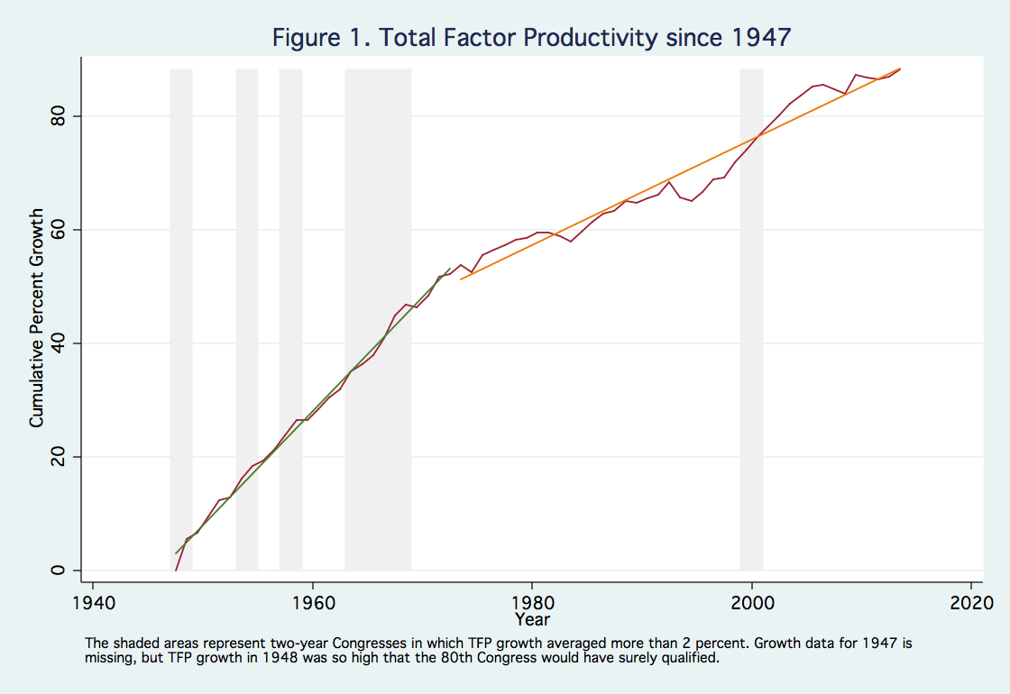 Figure 1 shows cumulative growth in TFP since 1947. The shaded areas represent two-year Congresses in which TFP growth averaged more than 2 percent. Note the slowdown in trend TFP growth beginning in 1973, and the lower frequency of two-year periods of 2 percent TFP growth. If a performance bonus could return the United States to pre-1973 levels of growth, the policy would be an astounding success.