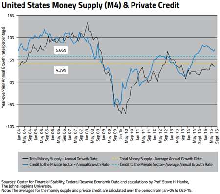 In the U.S., movements in the money supply (Divisia M4) and private credit tend to move in the same direction. Since 2013, the year-over-year growth rate of the money supply, broadly measured, has started to increase (see the accompanying chart).