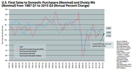 This linkage between the growth rate in broad money (Divisia M4) and nominal aggregate demand (measured by the proxy final sales to domestic purchasers) can be observed in the accompanying chart. The interesting aspect of the chart is that it confirms that the U.S. is still in a growth recession — the U.S. is growing, but growing at below its trend rate when measured by final sales to domestic purchasers (2.62 percent versus 4.85 percent). This has resulted, in part, because broad money growth has been anemic, even though it has picked up the pace recently.