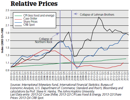 Just which sectors realized big swings in relative prices during the last U.S. aggregate demand bubble? Housing prices, measured by the Case-Shiller home price index, were surging, increasing by 45 percent from the first quarter in 2003 until their peak in the first quarter of 2006. Share prices were also on a tear, increasing by 66 percent from the first quarter of 2003 until they peaked in the last quarter of 2007. The most dramatic price increases were in commodities, however. Measured by the Commodity Research Bureau's spot index, commodity prices increased by 92 percent from the first quarter of 2003 to their pre-Lehman Brothers peak in the second quarter of 2008.