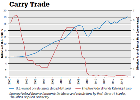 In addition to the bubbles spawned in the U.S., the Fed's artificially low interest rates set off a wild yield-chasing scramble and leveraging lunacy. This gave rise to bubbles abroad and currency war polemics. The accompanying carry trade chart shows the massive increase in U.S. assets abroad. These were fueled by hot-money flows during the Bernanke years.