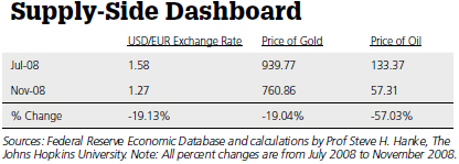 By ignoring this, Bernanke was flying blind in the initial months of the crisis. In consequence, the Fed failed to stabilize the USD/EUR exchange rate, which swung dramatically in the months surrounding the collapse of Lehman Brothers in September 2008 (see the accompanying table). This in turn created wild swings in the prices of gold and oil. In addition, the annual inflation rate measured by the Consumer Price Index plunged from 5.6% in July 2008 to -2.1% in July 2009. With the demand for greenbacks and safe assets (read: U.S. Treasuries) soaring, the Fed was way too tight and didn't even know it.