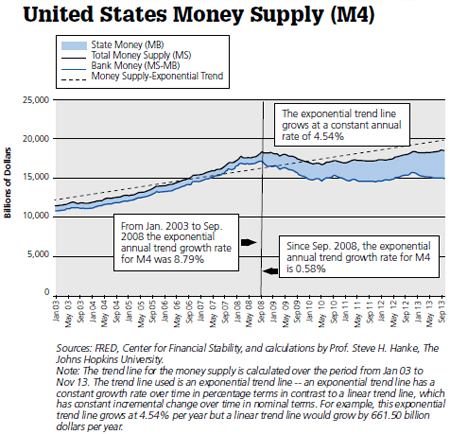 Since August 2008, the month before Lehman Brothers collapsed, the supply of state money has more than quadrupled, while bank money has shrunk by 12.1 percent — resulting in an anemic increase of only 4.5 percent in the total money supply (M4) (see the accompanying chart). The public is confused — as it should be. After all, the Fed has embraced contradictory monetary policies. On the one hand, when it comes to state money, the Fed has been ultra-loose. But, on the other hand, when it comes to the largest component of the money supply, bank money, a tight monetary stance has been embraced.