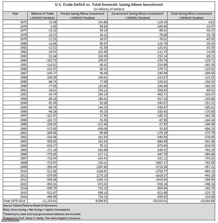 The table below shows that the data support the important trade identity. This table is unique because the state and local governments’ fiscal balances have been included in the “government saving minus investment” column. The cumulative trade deficit the U.S. has racked up since 1975 is about $11.154 trillion, and the total investment minus savings deficit is about $10.435 trillion, confirming the power of the identity.