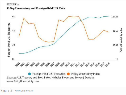 Figure 2 (nearby) plots a Policy Uncertainty Index alongside the value of foreign-held U.S. debt. It suggests a positive correlation between the two and supports the conclusion that any precipitous, unexpected, or unconventional policy measures undertaken by governments that can shake markets, including measures intended to drive up U.S. interest rates, will increase demand for U.S. debt, which will keep those rates low.