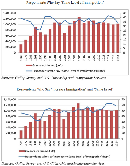Rather than the U.S. public opinion swinging against immigration as the number of green cards grows, the opposite is happening. Below is the historical Gallup polling data versus the number of green cards issued.