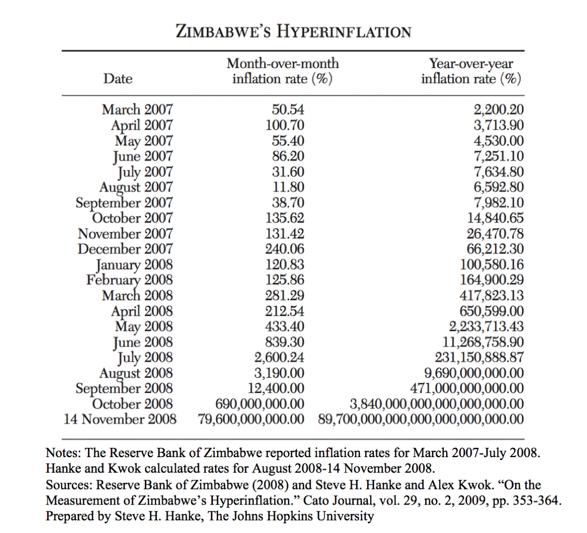 The table below is reproduced from a 2009 article I co-authored with Alex Kwok in the Cato Journal. It presents the correct measurements for Zimbabwe's hyperinflation episode. At 89,700,000,000,000,000,000,000%, Zimbabwe's was the second-highest episode of hyperinflation in world history. The dubious hyperinflation prize goes to Hungary. Its hyperinflation peaked in July 1946 when the monthly rate reached an astounding 41.9 quadrillion percent. Prices in Hungary were doubling every 15 hours.