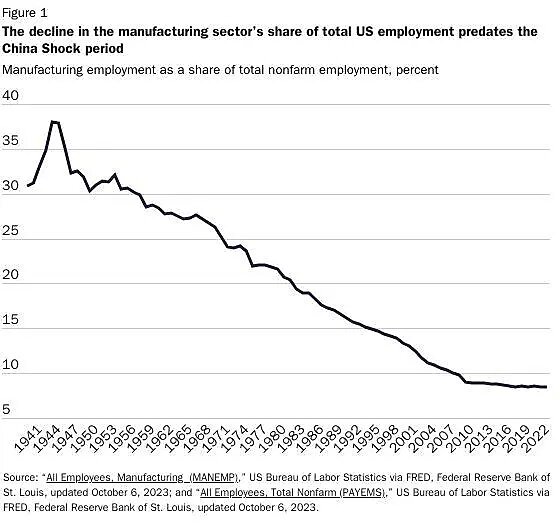 Other experts go even further and question not merely the China Shock papers’ numbers but their conclusions entirely. Economists Alan Reynolds and Philip Levy, along with former U.S. diplomat Charles Freeman, have argued that the China Shock likely caused an even smaller decline in U.S. manufacturing employment (if one at all) after accounting for other trends—especially productivity gains and non‐China imports. These and other scholars note that the manufacturing sector’s share of the U.S. workforce declined steadily before and during the shock period because of trade, technology, American workers’ increasing skill levels, and the economy’s natural transition to services—long-term trends that many other advanced economies (including net manufacturing exporters like Germany) experienced too.