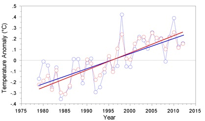Fig. 2. Annual average global temperature anomalies from the surface (red, HadCRUT4) and from the lower atmosphere (blue, UAH MSU), 1979-2012.