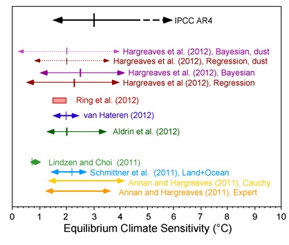 Fig. 3. Climate sensitivity estimates from new research published since 2010 (colored), compared with the range given in the IPCC Fourth Assessment Report (black). The arrows indicate the 5 to 95% confidence bounds for each estimate along with the mean (vertical line) where available. Ring et al. (2012) present four estimates of the climate sensitivity and the red box encompasses those estimates. The right-hand side of the IPCC range is dotted to indicate that the IPCC does not actually state the value for the upper 95% confidence bound of their estimate. The thick black line represents the IPCC's "likely" range.