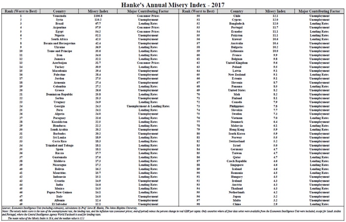 Venezuela holds the inglorious tile of the most miserable country in 2017, as it did in both 2016 and 2015. The failures of President Nicolas Maduro's socialist, corrupt petroleum state have been well documented over the past year, including by my measurements of Venezuela’s hyperinflation. Not only is Venezuela the most miserable country in the world, but its Misery Index score has dramatically increased since 2016.