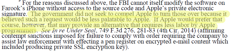 That hypothetical possibility is raised explicitly by the Justice Department in a footnote to its most recent motion in its ongoing litigation with Apple, which explains that the FBI had not gone that route because it “believed such a request would be less palatable to Apple.” Having tried it the easy way, the FBI suggests it’s happy to do things the hard way: “If Apple would prefer that course, however, that may provide an alternative that requires less labor by Apple programmers.”