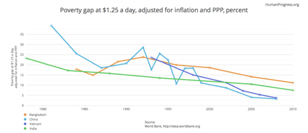The graph below shows the percentage of the population living on less than $1.25 a day in Bangladesh (orange), China (blue), Vietnam (purple), and India (green) beginning in the 1980s. The dollar figure is, again, adjusted for inflation and purchasing power parity.