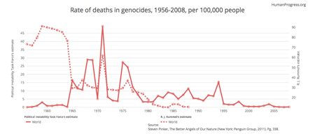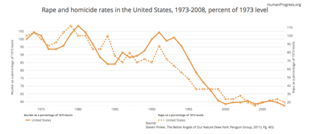 Third, consider violence. In The Better Angels of Our Nature: Why Violence Has Declined—a book that spans 800 pages and millennia of human development—Steven Pinker of Harvard University documents a tremendous decline in global violence. According to Pinker, “Tribal warfare was nine times as deadly as war and genocide in the 20th century. The murder rate in medieval Europe was more than thirty times what it is today. Slavery, sadistic punishments, and frivolous executions were unexceptionable features of life for millennia, then were suddenly abolished. Wars between developed countries have vanished, and even in the developing world, wars kill a fraction of the numbers they did a few decades ago. Rape, hate crimes, deadly riots, child abuse—all substantially down.”