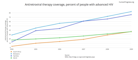 Last, but not least, consider disease. Measles, polio, and cholera, which destroyed innumerable lives in the past, have been all but eradicated. The spread of HIV/AIDS has been checked by the increasing use of marvelous antiretroviral (ARV) therapies. Some 10 million people, mostly Africans, are being treated with ARVs—an intervention mostly financed by the West. Even cancer rates, which have increased together with life expectancy, are beginning to decline—at least in rich countries. Speaking of living longer, the average global life expectancy at birth hovered around 30 years from the Upper Paleolithic to 1900. Even in the richest countries, like those of Western Europe, life expectancy at the start of the 20th century rarely exceeded 50 years. Today, the average global life expectancy is 68 years.