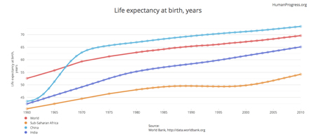 If anything, the speed of human progress seems to be accelerating. As Charles Kenny of the Center for Global Development writes, “4.9 billion people—the considerable majority of the planet—[live] in countries where GDP has increased more than fivefold over 50 years. Those countries include India, with an economy nearly 10 times larger than it was in 1960, Indonesia (13 times), China (17 times), and Thailand (22 times larger than in 1960). Around 5.1 billion people live in countries where we know incomes have more than doubled since 1960, and 4.1 billion—well more than half the planet—live in countries where average incomes have tripled or more.”