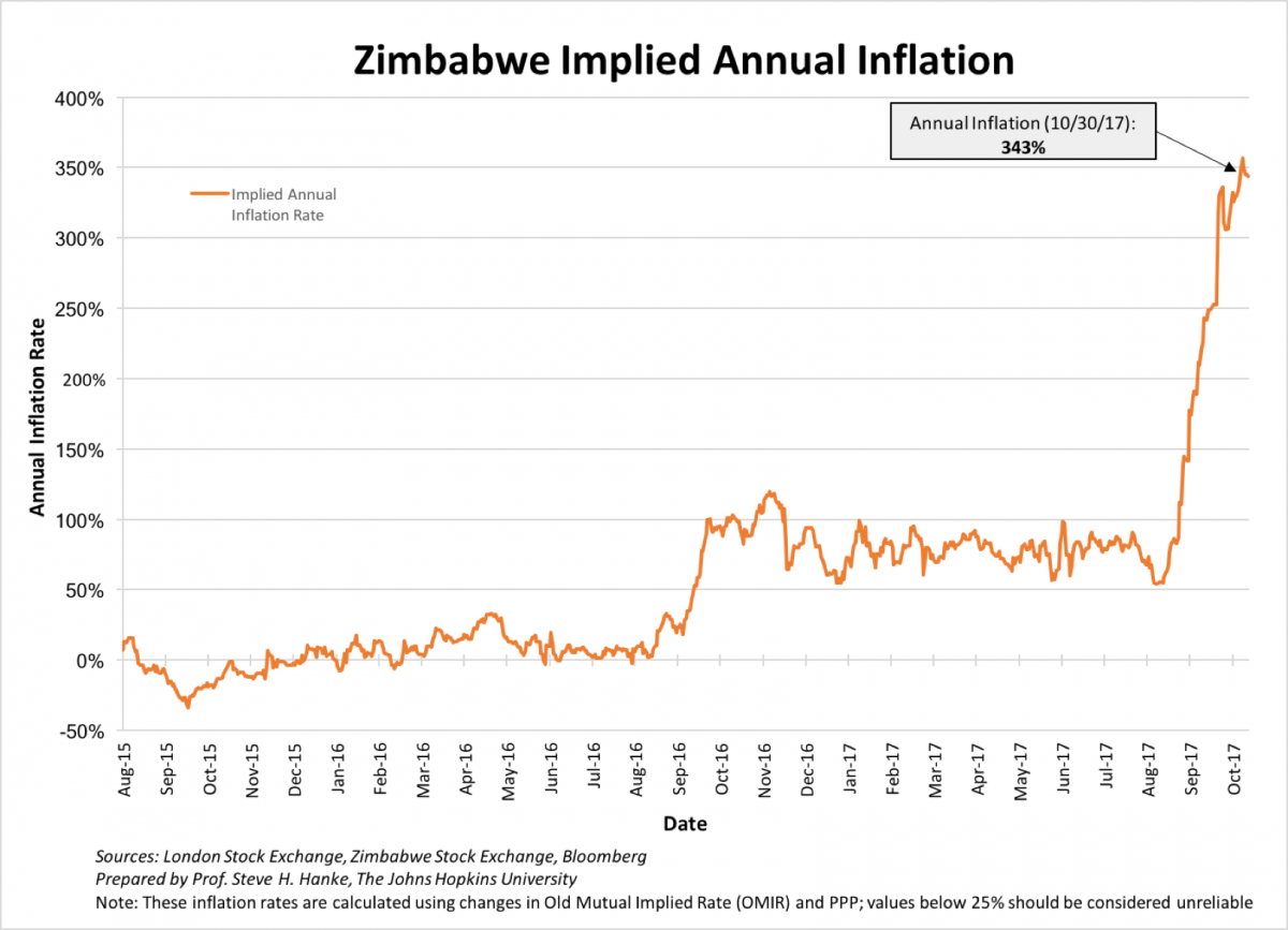 It turns out that Zimbabwe, recently, has also proven me wrong. On October 17, 2017, Zimbabwe entered its second episode of hyperinflation in less than 10 years. The chart below shows what the annual inflation rate for Zimbabwe is today: 343%.