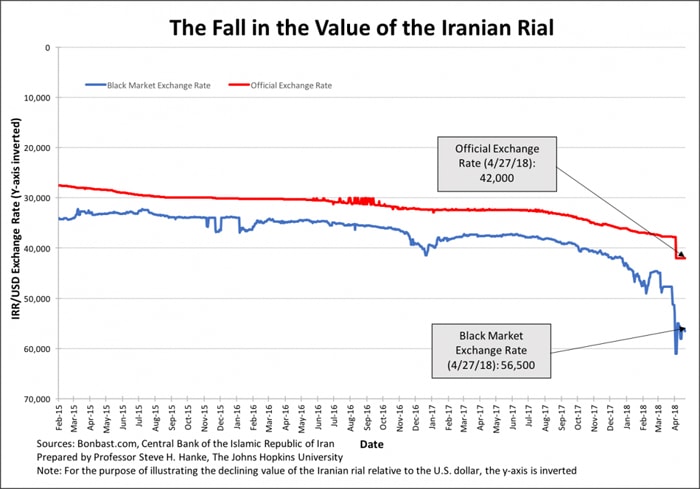 A way to take the temperature of a patient, such as Iran, on a real time basis is to observe the black-market (read: free-market) Iranian rial — U.S. dollar (IRR/USD) exchange rate. The chart below shows the course of the official and black-market IRR/USD rates.
