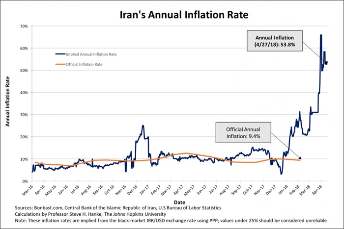 By using the IRR/USD exchange rate, which represents the most important price in Iran, I estimate Iran's inflation rate. Indeed, the black-market exchange rate can be reliably transformed into accurate measurements of countrywide inflation rates. The chart below shows how Iran's implied annual inflation rate has surged to an annual rate of 53.8%, with the collapse of the rial's value against the U.S. dollar.