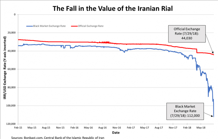 Iran’s rial plunged from 98,000 IRR/USD on Saturday to 112,000 IRR/USD on Sunday on Tehran’s Ferdowsi Street. That stunning 12.5% one-day plunge has pushed the rial into a classic death spiral. The last time the rial was in a grip of such a spiral was back in September 2012.