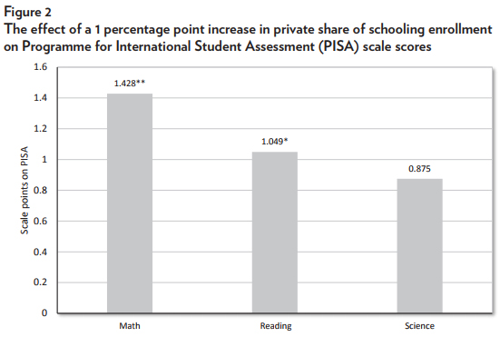 In the study, I examine how fluctuations in the private share of schooling within 52 countries from 2000 to 2012 influence Programme for International Student Assessment scores while controlling for any country-level changes in factors such as GDP, population, schooling enrollment, and government expenditures. As shown in figure 2 from the analysis, the preferred model indicates that a 1-percentage point increase in the private share of schooling enrollment within a country increases student math achievement by 1.4 points and reading achievement by 1 point.
